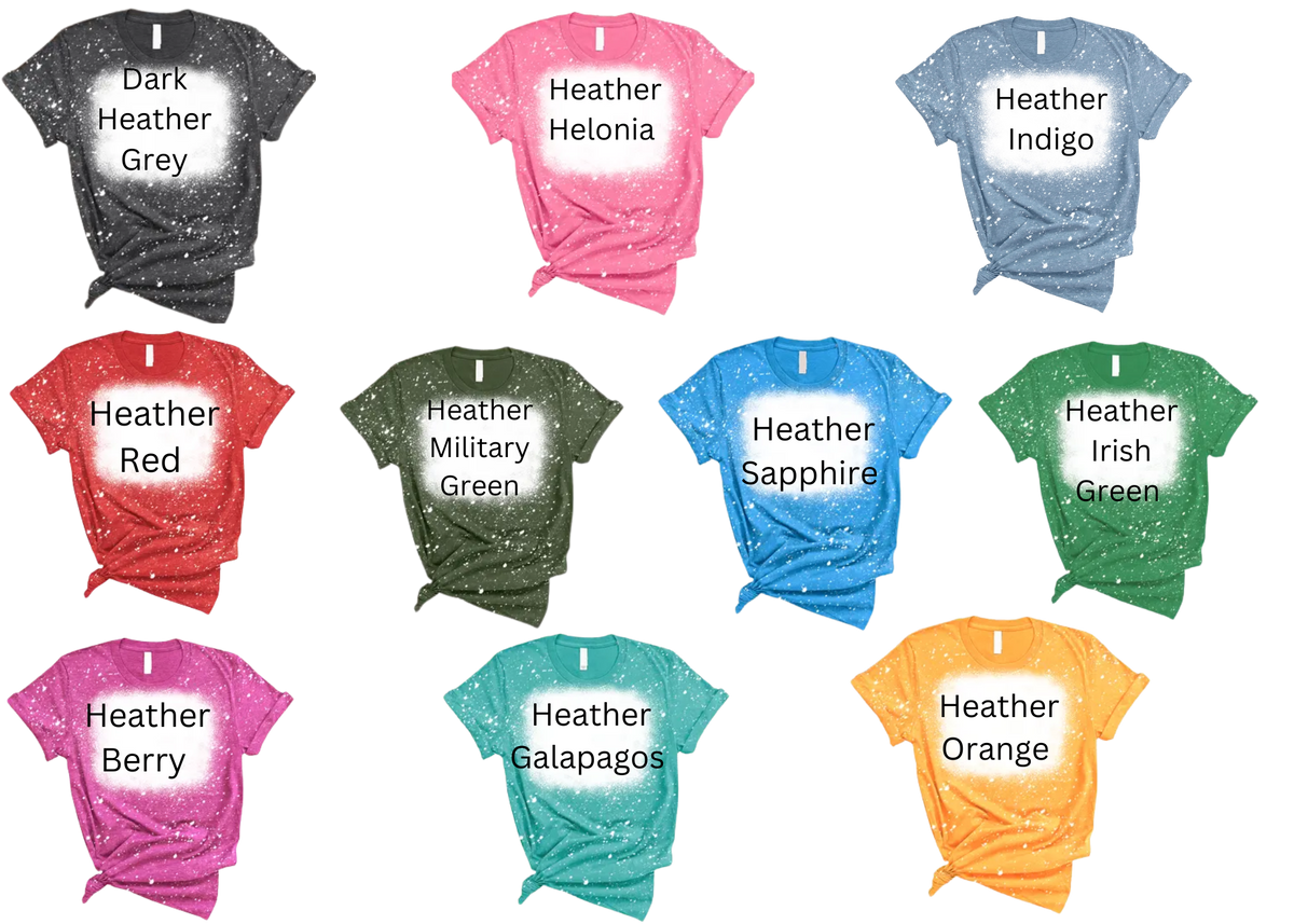 This bleached soft-style t-shirt is a trendy, comfortable shirt featuring a unique, hand-bleached design. Made from high-quality cotton-poly blend fabric, these shirts are lightweight, breathable, and ultra-soft, perfect for all-day wear. The bleached effect creates a one-of-a-kind, vintage-inspired look, often with distressed patterns or faded color variations. Available in a variety of colors and designs, they offer a stylish, effortlessly cool aesthetic.