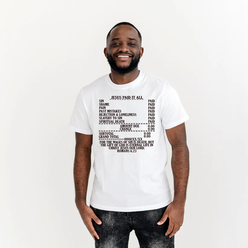 The "Jesus Paid It All" T-shirt is a powerful expression of faith and gratitude. Featuring simple yet bold typography, this design serves as a reminder of the ultimate sacrifice and the grace that comes with it. Whether you're wearing it to church, for a casual outing, or as a daily declaration of your faith, this shirt is a testament to the love and redemption found in Jesus. Made from soft, high-quality fabric, it offers both comfort and a message of hope—perfect for wearing wherever you go to share the good news.