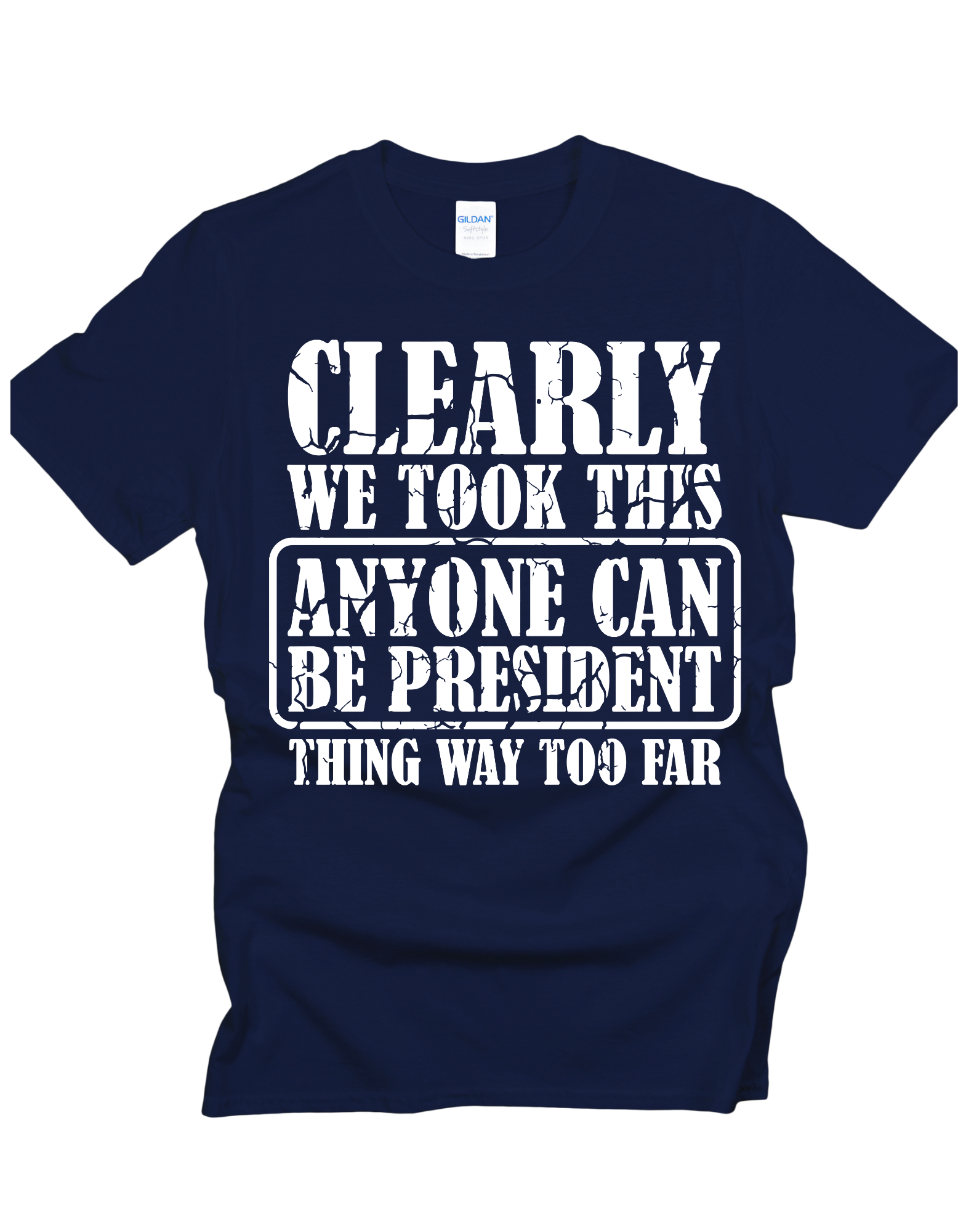 This T-shirt features the phrase "Clearly We Took This Anyone Can Be President Thing Way Too Far" boldly printed on the front. It's a piece of sarcastic political humor, perfect for those who enjoy making a statement with their fashion choices.